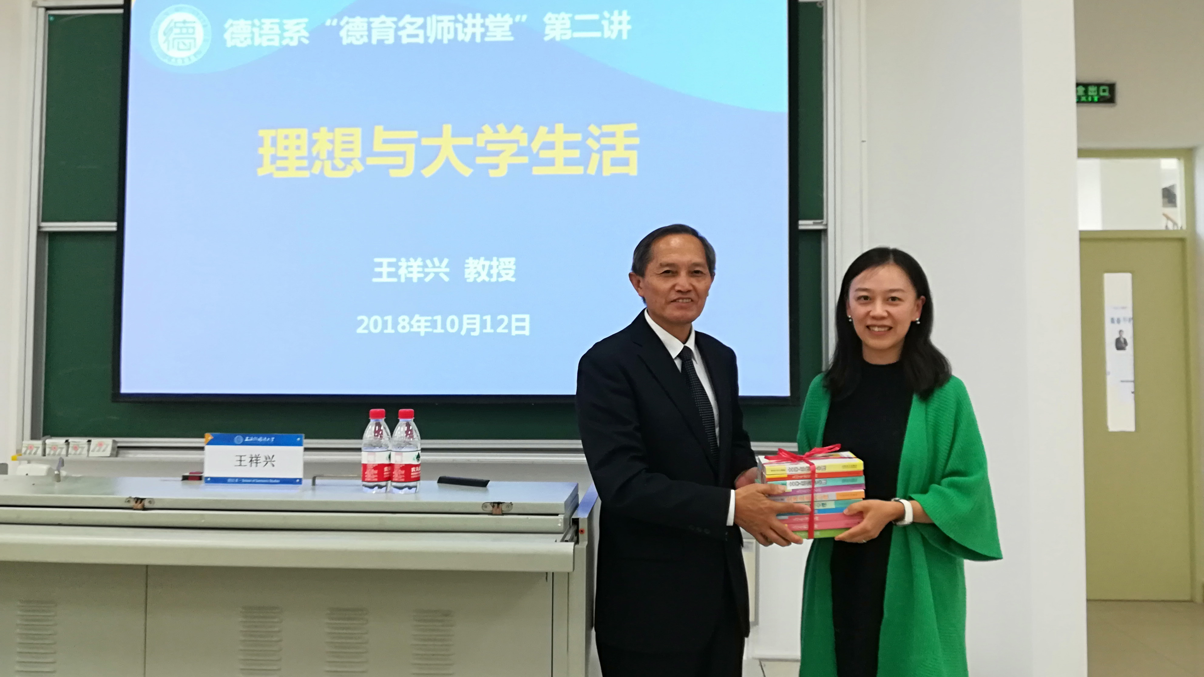 讲座的最后,王教授以“认识大学生的历史使命”为话题,希望同学们要在新的起点上继往开来,要立志做大事,在实现中国梦的实践中放飞青春梦想。讲座结束后,王教授向德语系“德育名师讲堂”赠送了他主编的《新世纪大学生心理研究》系列丛书,希望同学们有信念、有梦想、有奋斗、有奉献,度过有意义的人生。
