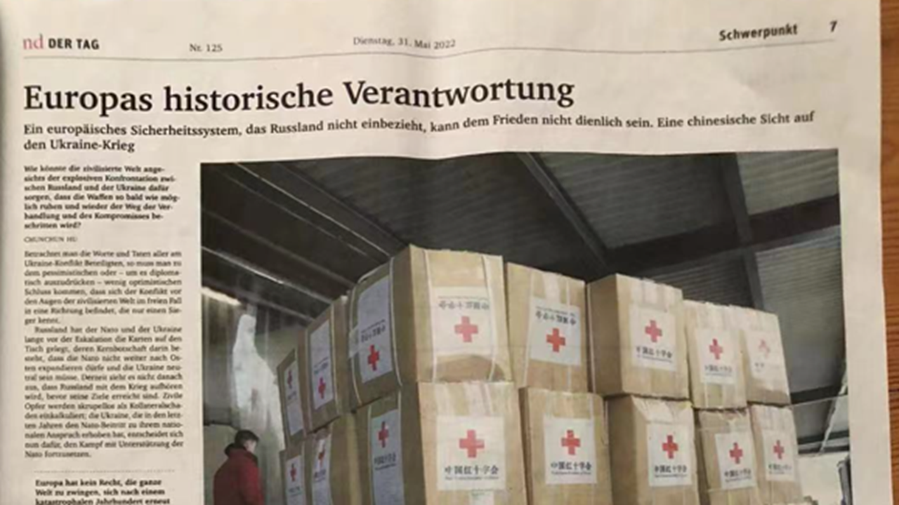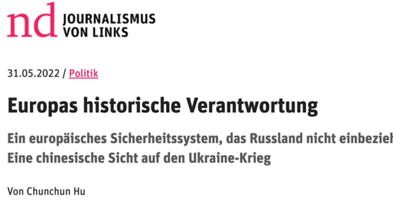 丹麦政论平台 Solidaritet 2022年6月16日发表丹麦文版(由Klaus Schulte教授从德文转译),标题:“中国认为欧洲为战争负有历史性责任”