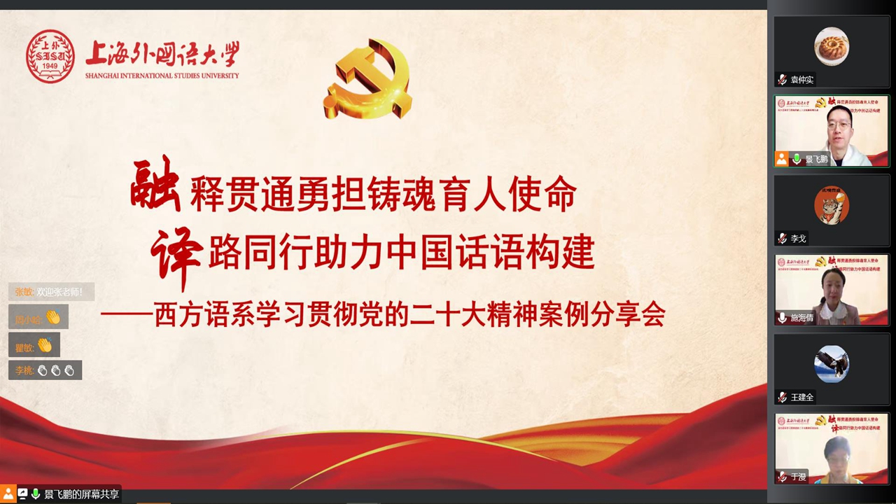 为持续推动学习宣传贯彻党的二十大精神,2022年12月12日,上外西方语系组织开展“融释贯通勇担铸魂育人使命,译路同行助力中国话语构建”师生联合主题党日活动。张静副校长参加此次活动,系党总支书记施海倩简单介绍活动背景、意义及准备情况,活动由西方语系辅导员、兼职组织员景飞鹏主持,系全体师生党员共同参会。