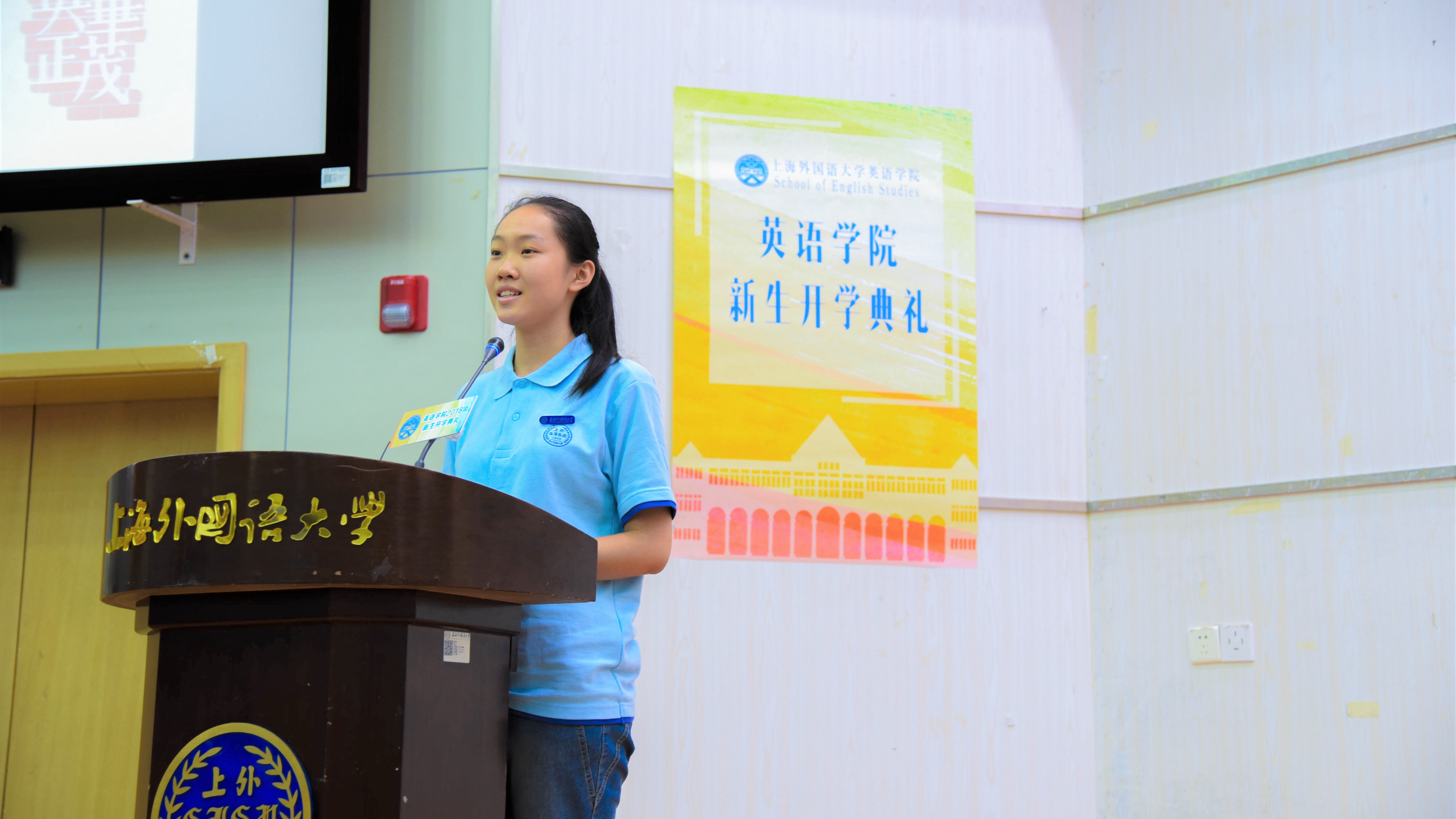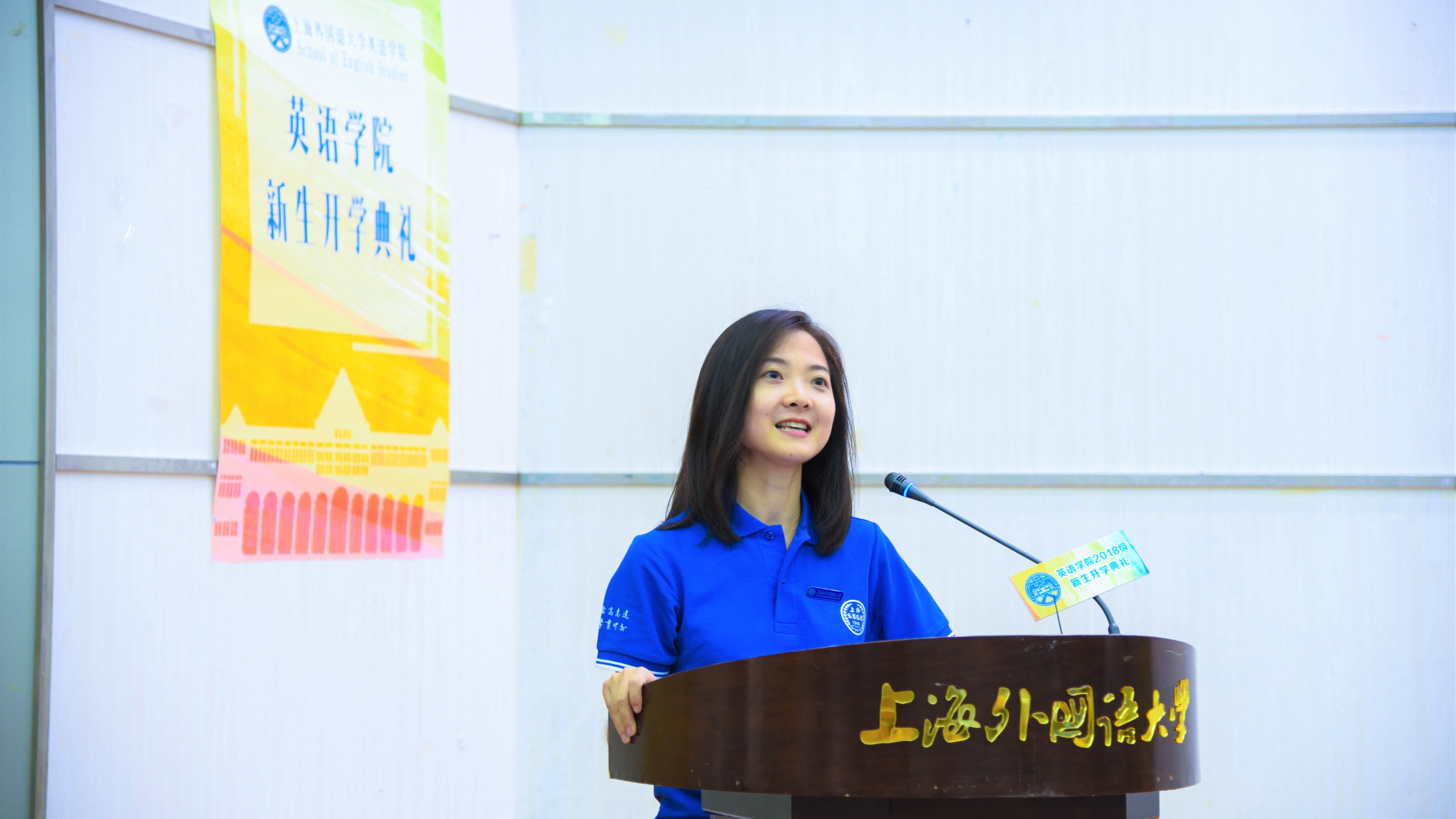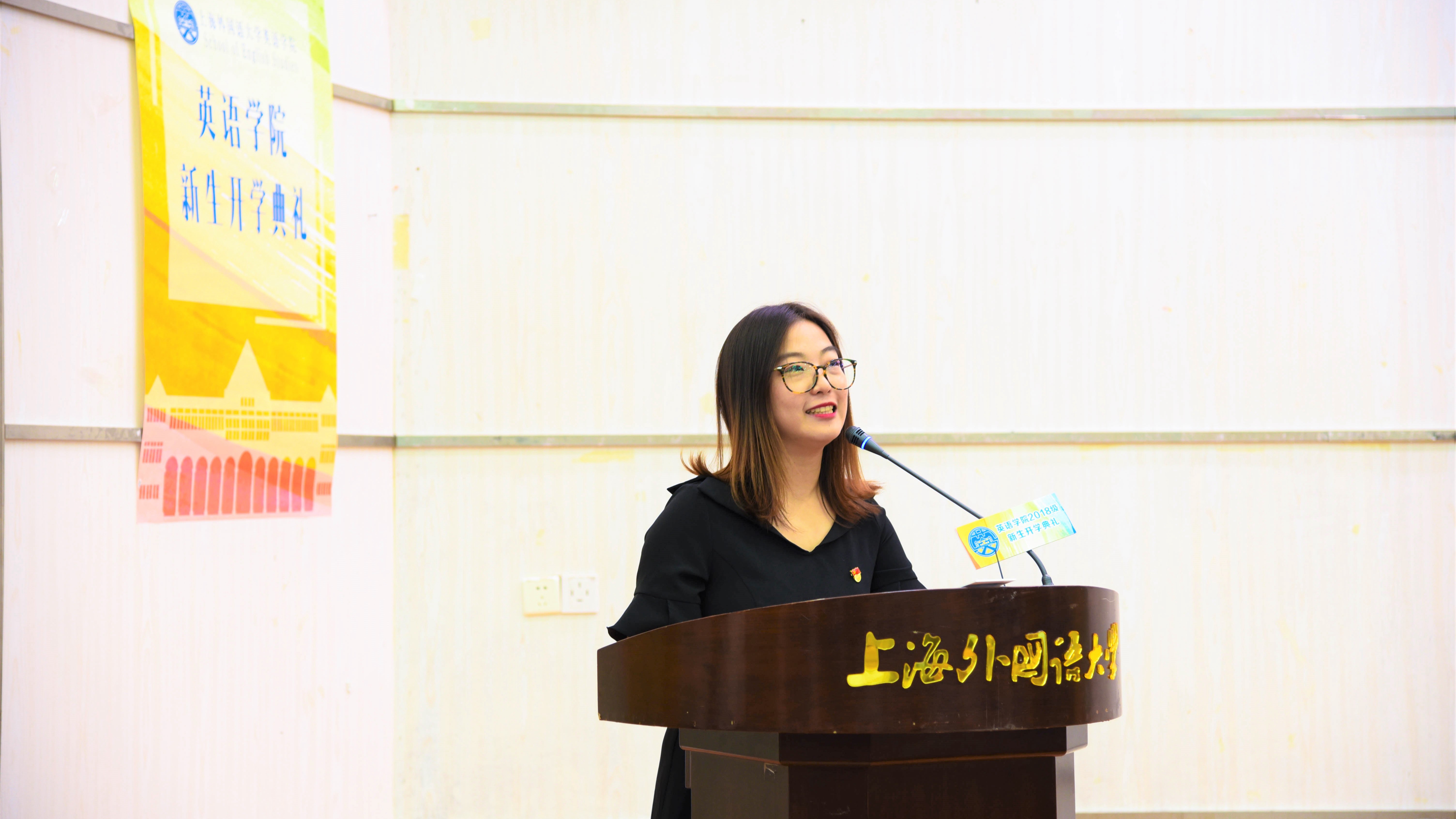 典礼在热烈的掌声中正式开始。2018级本科翻译专业新生史韵作为本科新生代表首先发言。她结合自己从幼儿园大班就开始的英语学习经历,分享她所感受到的英文之美,表达对英语的热爱。她代表新生表示,定会珍惜在英院四年学习的大好机会,从学习英语转向英语专业学习,将对英语的热爱,转化为对成为卓越英语专业人才的追求,以最蓬勃的姿态翩翩起舞,以自身的努力,展现英语专业的魅力。