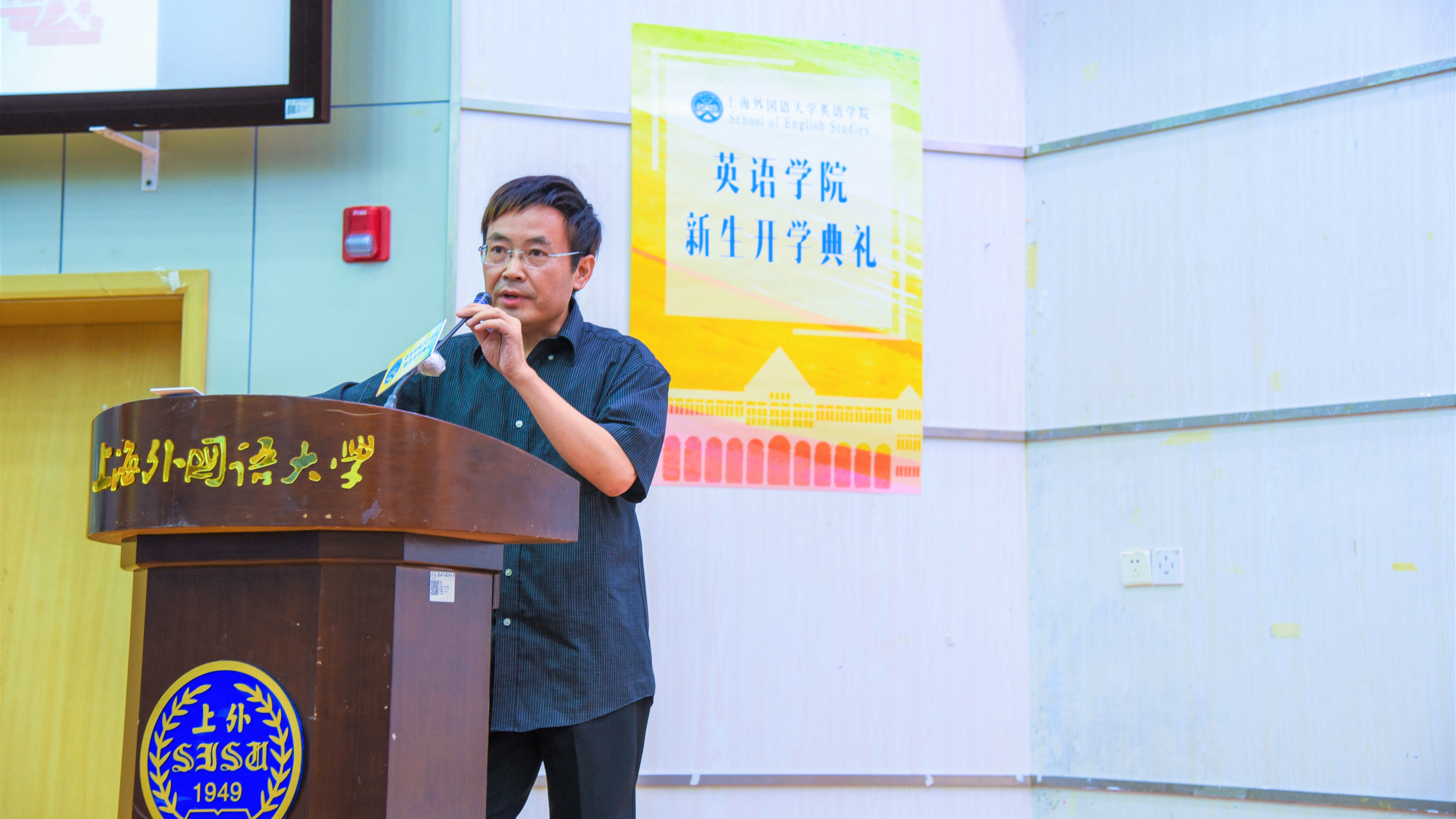 最后,查明建院长致辞。查院长代表学院对2018级新生表示热烈欢迎。他首先以经典诗文中的“松江”为例,指出,无论是本科生还是研究生,无论是专业学习还是学术研究,首先要做到心中有诗意,胸中有情怀,人生有境界。查院长简要回顾了中国外语教育一个半世纪的历史,指出英语专业现在正处于转型发展的关键时期。为适应时代的发展、满足国家对高层次英语专业人才的需要,英语学院从2010年开始实施“人文化改革”,提出“英语专业不是仅仅学英语的专业,而是通过英语来学习人文社科知识,培养人文领域专业人才”的理念,倡导英语专业以人文化、专业化为导向的转型发展。八年来的人文化改革取得了显著的成效,引领了全国英语专业的转型发展。查院长指出,上外英语学院的学术地位和社会声誉,是在方重、杨小石、李观仪、章振邦等前辈学者引领下,一代代英华人志存高远、刚毅坚卓、努力不懈、久久为功而创造的。新一代英华人要弘扬英语学院立德树人的优良传统,以高层次英语专业人才培养为核心驱动力,以学术研究和教师发展为两翼,全面提升学科建设水平和人才培养水平。为此,学院将在八年来人文化改革经验基础上,进一步深化改革,创设“人文班”,探索人文学科领域高层次英语专业人才培养的新途径。最后,查院长深情地鼓励在场的师生:无论过去我们取得了什么成绩,也无论将来我们会面临什么困难,我们都在心里对自己说一声:“而今迈步从头越!”