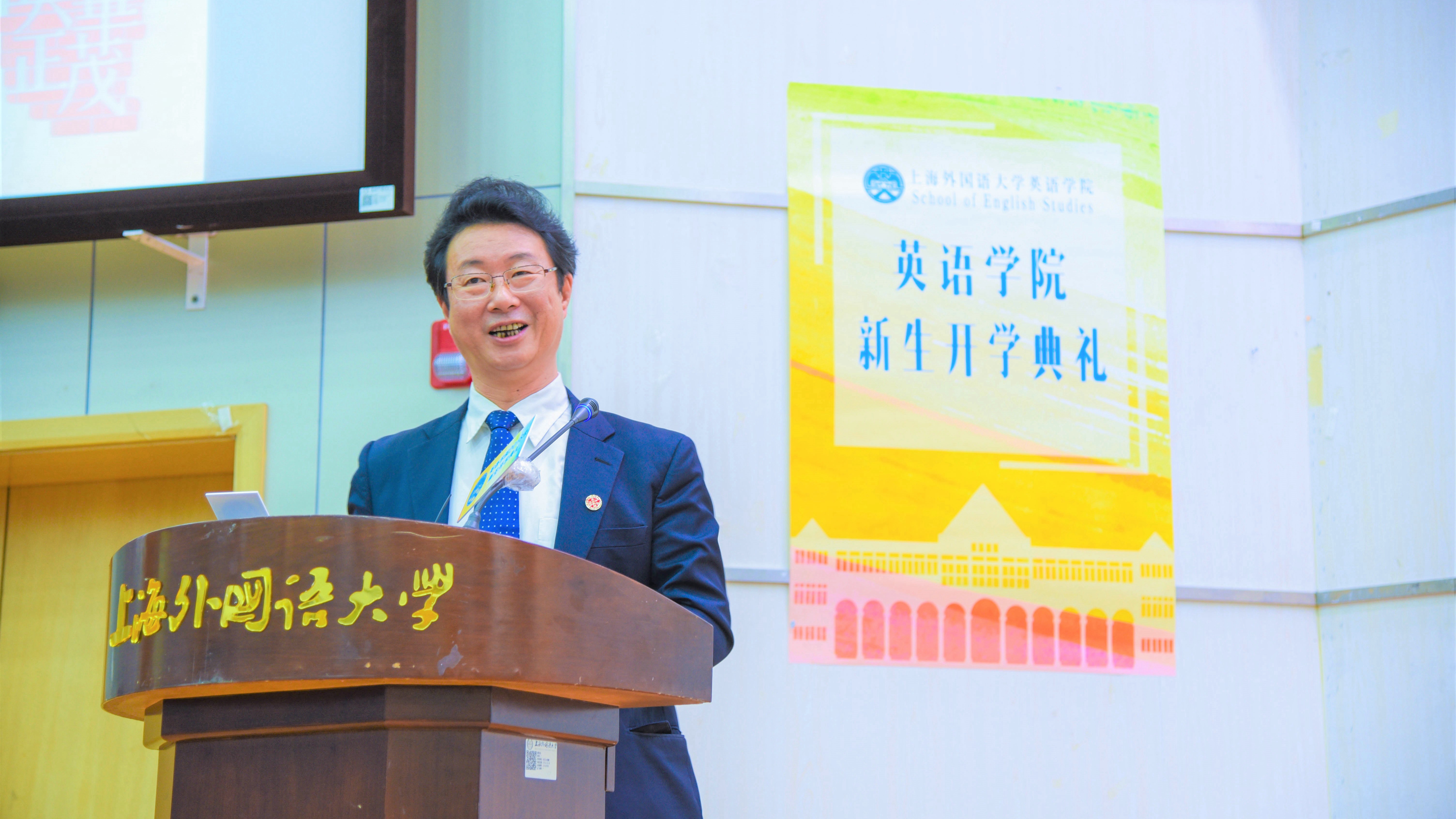 刘焱老师代表本科生班导师发言。刘老师首先表达了对新生们的欢迎和祝福。他对英院本科生导师制度做了详细介绍。本科生导师制是英院的优良传统,坚持做到传道、授业、解惑“一杆清”。学院安排经验丰富、认真负责的老师对学生进行指导,引领他们进入专业学习。刘老师对大一各个班级的班导师一一作了介绍,希望新生在这些班导师的引领下,尽快适应大学生活,融入英院大家庭,每天学有所获,在收获中成长。